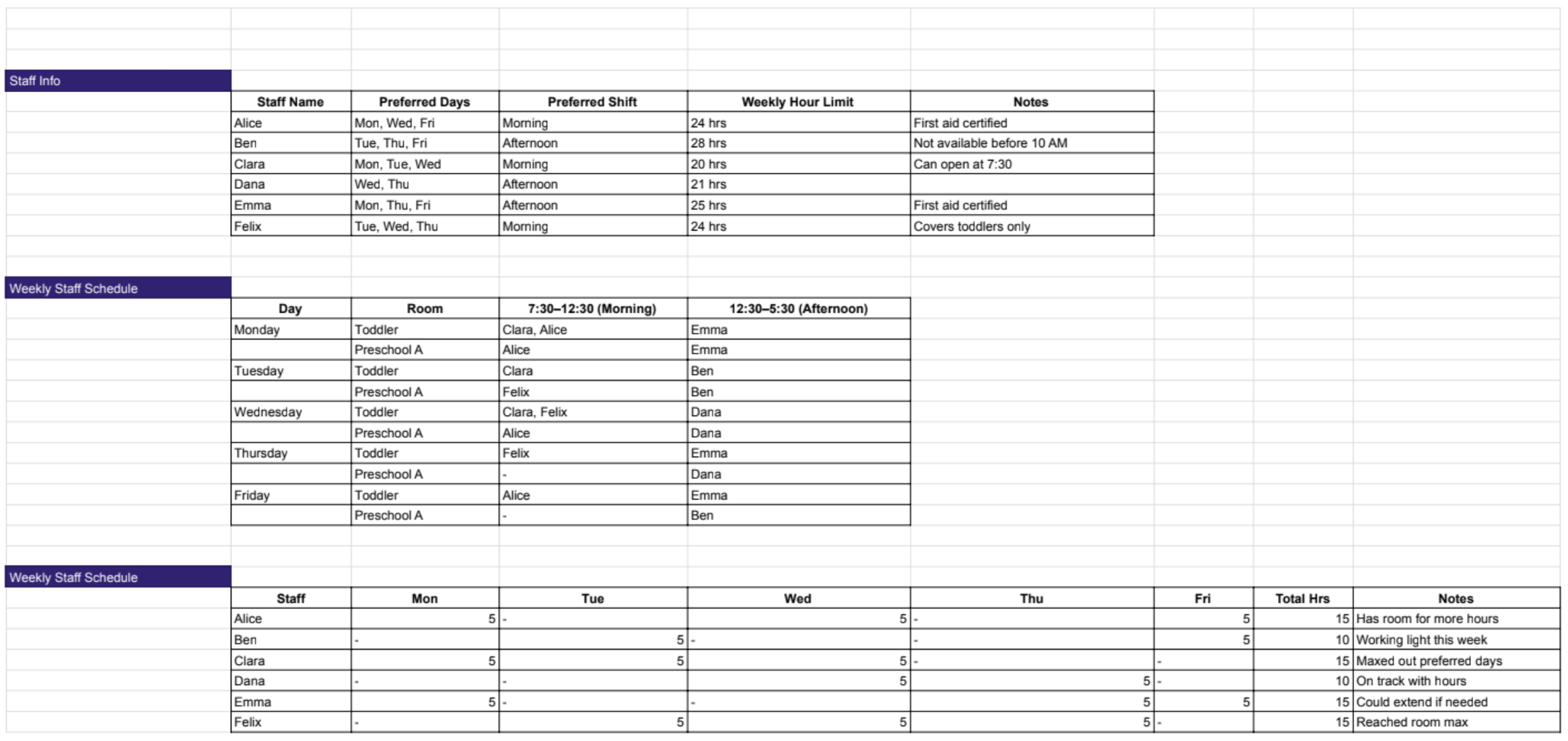 However, staff scheduling within these environments remains largely manual, time-consuming, and error-prone. Admins spend hours checking staff availability, mentally mapping teachers to classrooms, and resolving conflicts for every shift. This fragmented and inefficient process is the core problem we set out to fix.